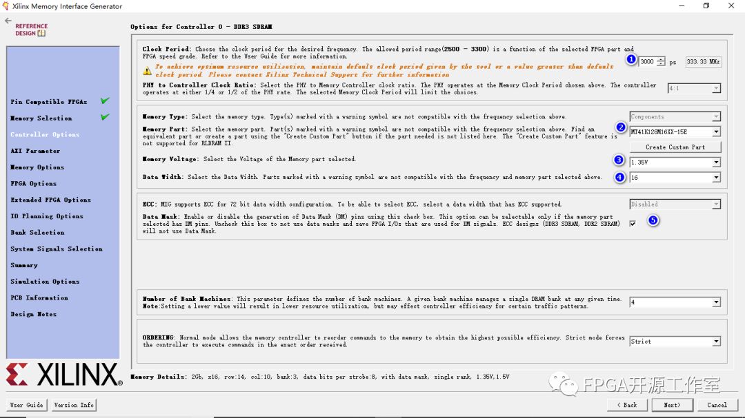 ④Memory Part :此選項為設(shè)計選擇內(nèi)存部件。 選擇可以從列表中創(chuàng)建或者可以創(chuàng)建新部件。MT41K128M16XX-15E。