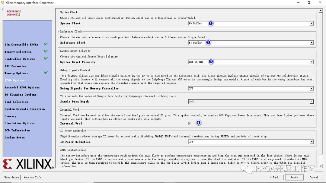 ②Reference Clock :(此選項為clk_ref信號對選擇時鐘類型(單端,差分,無緩沖或使用系統(tǒng)時鐘)。 當輸入頻率介于199和201 MHz之間時(即輸入時鐘周期介于5,025 ps(199 MHz)和4,975 ps(201 MHz)之間),將顯示Use System Clock(使用系統(tǒng)時鐘)選項。參考時鐘頻率基于數(shù)據(jù)速率 并注意添加MMCM以創(chuàng)建高于1,333 Mb / s的適當ref_clk頻率。當選擇No Buffer選項時,IBUF原語不會在RTL代碼中實例化,并且引腳不會分配給參考時鐘。)No Buffer。