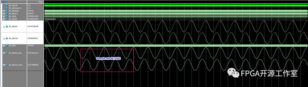 整個仿真結(jié)構(gòu)如圖1所示,由相位累加控制器和sin波形存儲器組成。仿真生成采樣率為44.1KHZ @1KHZ正玄波和余弦波(相位相差90度)。