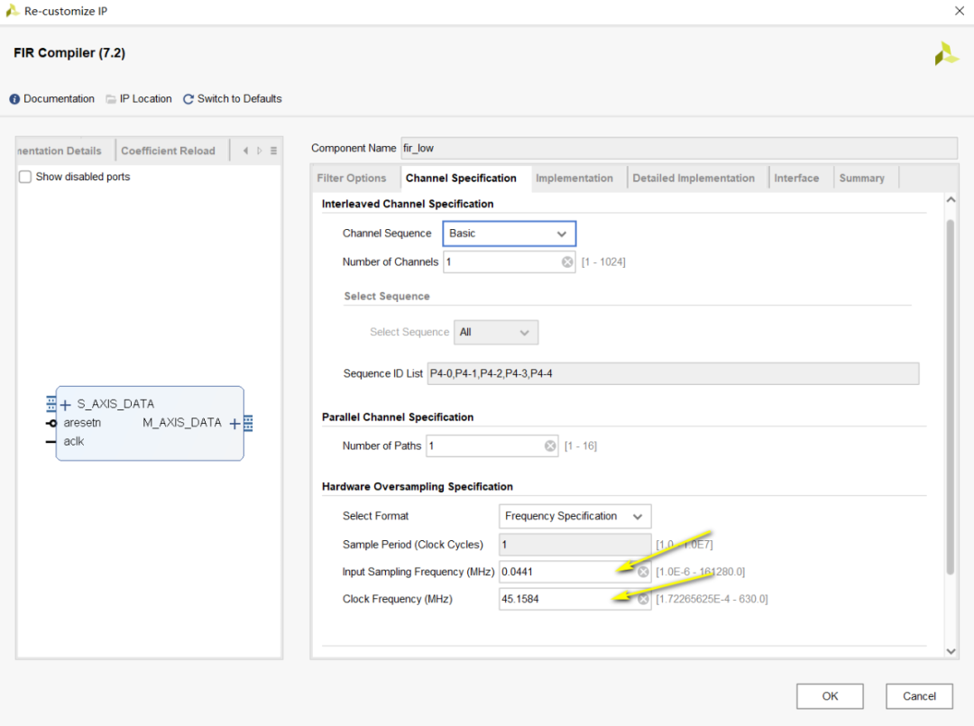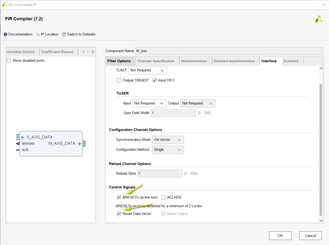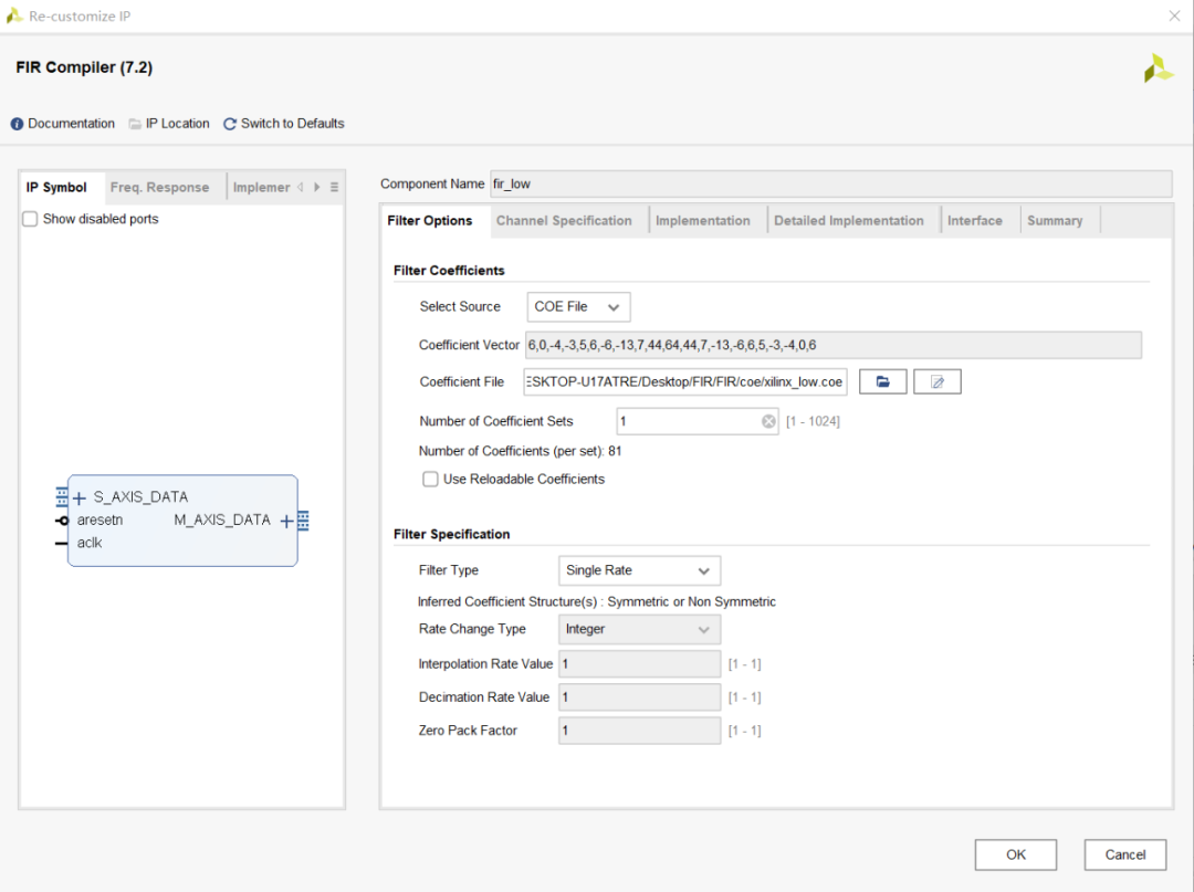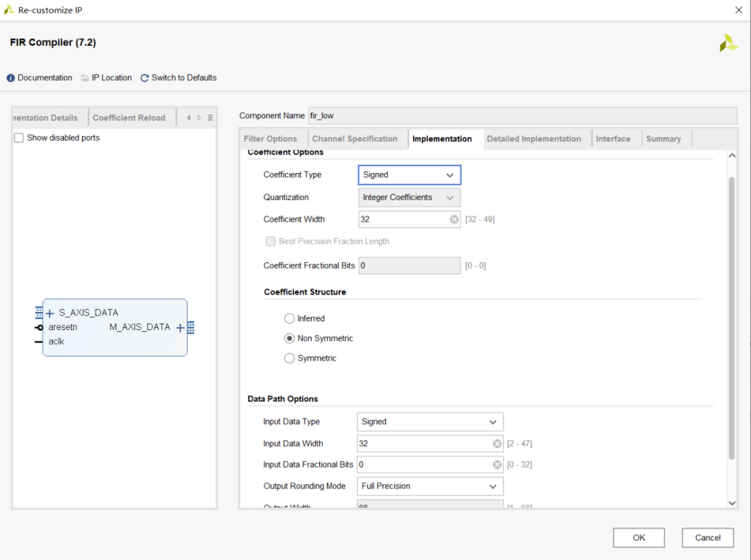 如上圖所示,左側(cè)包含IP Symbol、Freq.Response、Implementation Details和CoefficientReload。右側(cè)包括Filter Options、Channel Specification、Implementation、Detailed Implementation、Interface和Summary.