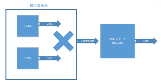 如上圖所示,混頻模塊內(nèi)部包含兩個(gè)dds模塊,一個(gè)產(chǎn)生2khz sine波,一個(gè)產(chǎn)生3khz sine波,然后相乘得到1khz+6khz的混頻,然后使用xilinx FIR IP設(shè)計(jì)一個(gè)低通濾波器濾掉6khz,最后只剩1khz。