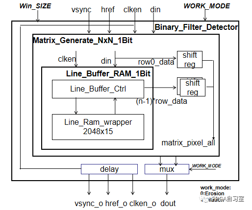 ? ?形態(tài)學(xué)濾波算法的FPGA硬件實現(xiàn)原理圖,如下圖所示。算法的輸入輸出接口信號采用標準的 VGA時序接口,即行場信號、數(shù)據(jù)和數(shù)據(jù)使能信號。算法模板輸入?yún)?shù)主要有兩個,Win_SIZE 表示窗口大小,WORK_MODE 表示工作在腐蝕還是膨脹模式,根據(jù)需要配置自己想要的模板大小和工作模式。