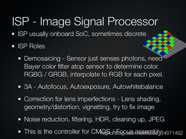 像素對某些波長組之間的光很敏感,本質(zhì)上它們是顏色不可知的。獲取彩色圖像的方法是在頂部放置一個濾鏡(通常是拜耳圖案濾色鏡),然后對相鄰像素的顏色進行插值。8 MP CMOS不會為每個像素感應(yīng)紅色,綠色和藍色,而是為每個像素感應(yīng)一種顏色,然后ISP根據(jù)其旁邊的顏色猜測顏色。這就是所謂的去馬賽克,它可能是ISP的主要工作,并且有許多秘密的調(diào)味方法來計算此插值圖像。此外,ISP還負責其他所有內(nèi)部管理工作,它可以控制相機系統(tǒng)的自動對焦,曝光和白平衡。最近添加了對不完善的鏡頭系統(tǒng)(例如,在instagram中添加的不完美鏡頭系統(tǒng)所賦予的漸暈或色差)等鏡頭缺陷的校正,以及HDR重組,降噪,其他濾鏡,臉部校正或臉部校正等功能。對象檢測以及色彩空間之間的轉(zhuǎn)換。ISP的功能之間存在差異,但這實際上是將拜耳數(shù)據(jù)獲取到可行的圖像陣列中的控制器。