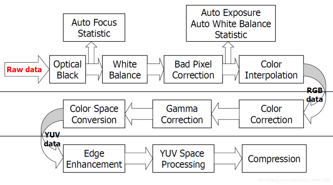 Bayer、黑電平補償 (black level compensation)、鏡頭矯正(lens shading correction)、壞像素矯正(bad pixel correction)、顏色插值 (demosaic)、Bayer 噪聲去除、 白平衡(AWB) 矯正、 色彩矯正(color correction)、gamma 矯正、色彩空間轉(zhuǎn)換(RGB 轉(zhuǎn)換為 YUV)、在YUV 色彩空間上彩噪去除與邊緣加強、色彩與對比度加強,中間還要進行自動曝光控制,圖像壓縮等。