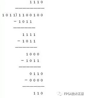 多位二進(jìn)制模2除法也類似于普通意義上的多位二進(jìn)制除法,但是在如何確定商的問題上兩者采用不同的規(guī)則。后者按帶借位的二進(jìn)制減法,根據(jù)余數(shù)減除數(shù)夠減與否確定商1還是商0,若夠減則商1,否則商0。多位模2除法采用模2減法,不帶借位的二進(jìn)制減法,因此考慮余數(shù)夠減除數(shù)與否是沒有意義的。實(shí)際上,在CRC運(yùn)算中,總能保證除數(shù)的首位為1,則模2除法運(yùn)算的商是由余數(shù)首位與除數(shù)首位的模2除法運(yùn)算結(jié)果確定。因?yàn)槌龜?shù)首位總是1,按照模2除法運(yùn)算法則,那么余數(shù)首位是1就商1,是0就商0。例如1100100÷1011=1110……110,列豎式計(jì)算:
