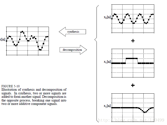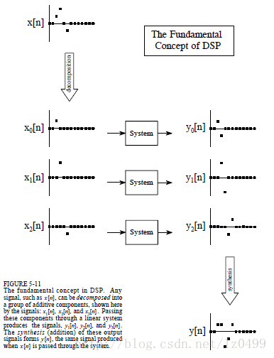 數(shù)字信號(hào)處理中,最為關(guān)鍵的步驟是信號(hào)的疊加。假設(shè)有如下圖的輸入信號(hào)x[n],經(jīng)過一個(gè)線性系統(tǒng)之后,輸出信號(hào)為y[n]。輸入信號(hào)可以分解為多個(gè)更為簡(jiǎn)單的信號(hào):x1[n],x2[n],x3[n],這些被稱為輸入信號(hào)分量。之后把各個(gè)輸入信號(hào)分量單獨(dú)的輸入到線性系統(tǒng)中,產(chǎn)生與之對(duì)應(yīng)的輸出信號(hào)分量:y1[n],y2[n],y3[n]。原始的輸入信號(hào)經(jīng)過線性系統(tǒng)之后,得到的輸出信號(hào)y[n]即為各個(gè)輸出信號(hào)分量的合成。線性系統(tǒng)中,通過這種方式獲得的輸出信號(hào)和原始信號(hào)直接通過系統(tǒng)得到的輸出結(jié)果是一樣的。正因?yàn)槿绱?,任何?fù)雜的數(shù)字信號(hào),我們應(yīng)該把它分解為更為簡(jiǎn)單的輸入信號(hào)分量,經(jīng)過線性系統(tǒng)后把輸出信號(hào)分量進(jìn)行合成即為最終的輸出信號(hào)。但是,如果分解的輸入信號(hào)不夠簡(jiǎn)單,那么這樣與分解之前的效果是一樣的,需要復(fù)雜的計(jì)算。