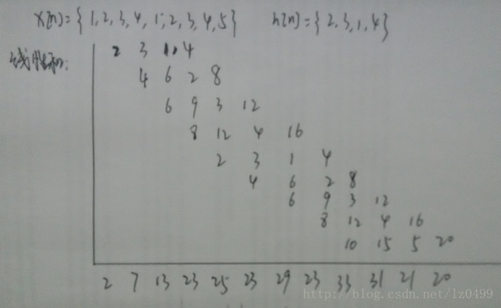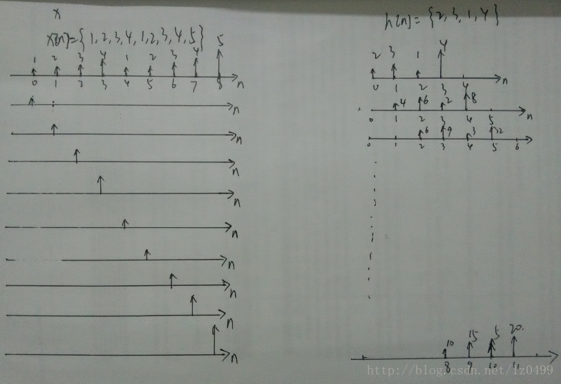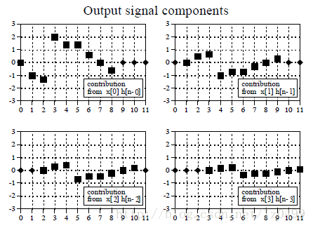 假設(shè)輸入信號(hào)為{1,2,3,4,1,2,3,4,5};脈沖反應(yīng)為:{2,3,1,4};則卷積計(jì)算過程相當(dāng)于如下所示,每一個(gè)輸入信號(hào)分量分解為單個(gè)脈沖函數(shù),經(jīng)過四個(gè)點(diǎn)的h[n]線性系統(tǒng)之后,其輸出結(jié)果即為h[n]+2*h[n-1]+3*h[n-2]+4*h[n-3]+ h[n-4]+2*h[n-1-5]+3*h[n-6]+4*h[n-7]+5h[n-8]。