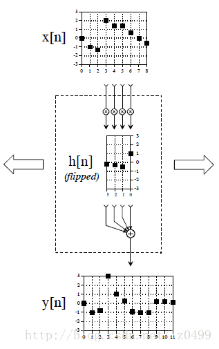 圖11,從輸出信號(hào)角度理解卷積,其相當(dāng)于一個(gè)卷積機(jī)器。如圖所示,假設(shè)輸入信號(hào)x[n],輸出信號(hào)y[n], 虛線方框里表示的是卷積機(jī)器,可以從左到右從右到左自由移動(dòng)。卷積機(jī)器放置的位置應(yīng)該與我們需要求得輸出信號(hào)采樣點(diǎn)對(duì)其,輸入信號(hào)的四個(gè)采樣點(diǎn)進(jìn)入到卷積機(jī)器,四個(gè)采樣點(diǎn)的數(shù)字分別于其對(duì)應(yīng)的脈沖反應(yīng)相乘,再把其乘積相加。例如為了計(jì)算y[6],需要把x[3],x[4],x[5],x[6]四個(gè)輸入信號(hào)輸送到卷積機(jī)器。相應(yīng)的,為了計(jì)算y[7],卷積機(jī)器必須右移一位到采樣點(diǎn)7的位置,這樣,進(jìn)入到卷積的四個(gè)信號(hào)分別是x[4],x[5],x[6], x[7],如此循環(huán)直到所有輸出信號(hào)分量被計(jì)算完成。