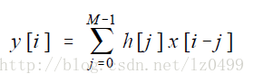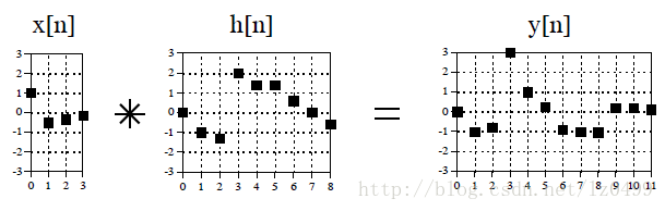 假設(shè)有N個(gè)點(diǎn)的輸入信號(hào)x[n],采樣點(diǎn)從0-N-1,有M個(gè)點(diǎn),脈沖反應(yīng)為h[n]的線性系統(tǒng),信號(hào)點(diǎn)從0-M-1。則這兩個(gè)信號(hào)的卷積將輸出有N+M-1個(gè)采樣點(diǎn)的信號(hào),下標(biāo)從0-N+M-2。用公式表示為: