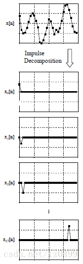 脈沖分解是卷積的基礎(chǔ)。如下圖所示,N個(gè)采樣信號(hào)經(jīng)過脈沖分解之后,形成N個(gè)信號(hào)分量,每個(gè)信號(hào)分量只包含原始信號(hào)的某一個(gè)采樣點(diǎn)信號(hào),而其他采樣點(diǎn)的值為0。假若某個(gè)信號(hào)只有一個(gè)非零點(diǎn),其他各點(diǎn)數(shù)值均為0,那么這個(gè)信號(hào)被稱為脈沖信號(hào)。