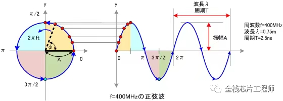 為了看清楚,我們將紅色點(diǎn)往下平面投影成粉色點(diǎn),粉色點(diǎn)與頻率軸的距離,這個距離占正弦波的周期的百分比,乘以360°就是相位。