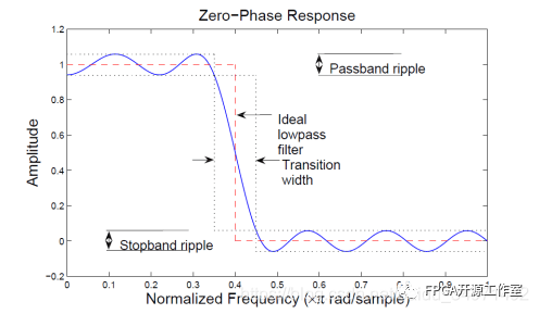 當(dāng)用有限脈沖響應(yīng)逼近時(shí),通帶/阻帶波紋和過渡帶寬度都是不希望出現(xiàn)的,且不可避免地與理想低通濾波器存在偏差。下圖說明了這些偏差: