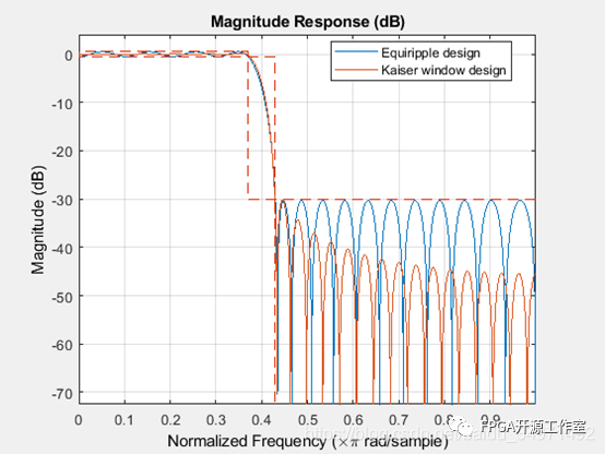 使用 Kaiser 窗方法設(shè)計(jì)與上述設(shè)定相同的濾波器,并將其響應(yīng)與等波紋濾波器進(jìn)行比較。