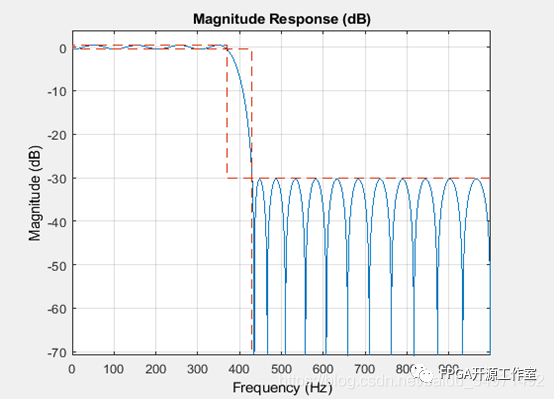 通過指定通帶和阻帶頻率以及通帶波紋和阻帶衰減,可以獲得最小階設(shè)計(jì)。然后,設(shè)計(jì)算法會選擇符合設(shè)定的最小濾波器長度。