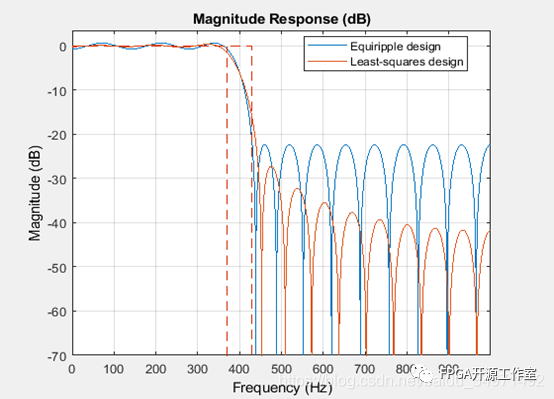 假設(shè)一個(gè) 30 階低通 FIR 濾波器,其通帶頻率為 370 Hz,阻帶頻率為 430 Hz,采樣率為 2 kHz。對于這組特定設(shè)定,可使用兩種設(shè)計(jì)方法:等波紋法和最小二乘法。下面我們?yōu)槊糠N方法設(shè)計(jì)一個(gè)濾波器,并比較結(jié)果。