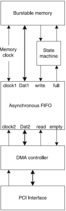 跨時(shí)鐘域傳輸數(shù)據(jù)用得最多的方法就是使用先入先出(即FIFO)結(jié)構(gòu)。FIFO可以用于在兩個(gè)異步時(shí)鐘域之間傳輸多個(gè)比特信號(hào)。我們通??吹降腇IFO應(yīng)用包括在兩個(gè)標(biāo)準(zhǔn)總線之間傳輸數(shù)據(jù),以及從可突發(fā)訪問(wèn)的存儲(chǔ)器中讀出數(shù)據(jù)或者對(duì)其寫入數(shù)據(jù)。例如,如圖11所示,顯示的是一個(gè)可突發(fā)訪問(wèn)存儲(chǔ)器與一個(gè)PCI總線之間的接口。