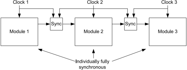 在頂層為設(shè)計(jì)劃分好設(shè)計(jì)分區(qū)是一個(gè)好的設(shè)計(jì)實(shí)踐行為,這樣任何功能模塊外面都包含一個(gè)獨(dú)立的同步器模塊。這樣有利于在劃分模塊的基礎(chǔ)上實(shí)現(xiàn)所謂的理想時(shí)鐘域情況(即整個(gè)設(shè)計(jì)模塊只有一個(gè)時(shí)鐘),如圖15所示。