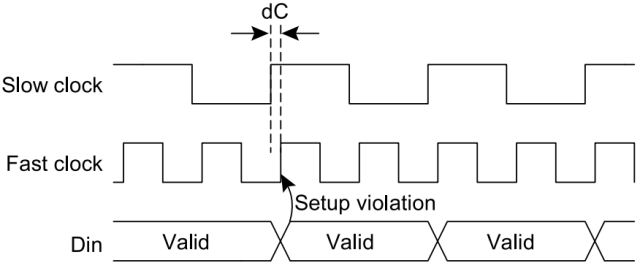 如圖4所示,低速時(shí)鐘的周期是高速時(shí)鐘周期的兩倍。低速時(shí)鐘上升沿與高速時(shí)鐘上升沿之間的間隔為常量,而且總是等于dC。由于這兩個(gè)時(shí)鐘的這種相位匹配關(guān)系,dC總是保持不變(假定頻率沒(méi)有漂移),而且在這個(gè)例子中,dC總是大于邏輯延時(shí)與高速時(shí)鐘驅(qū)動(dòng)的觸發(fā)器建立時(shí)間之和。