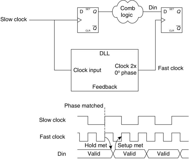 考慮這樣一個(gè)例子,一個(gè)信號(hào)從低速時(shí)鐘域傳遞進(jìn)入另一個(gè)時(shí)鐘域,而此時(shí)鐘域的周期是低速時(shí)鐘域的一半。根據(jù)前面的分析,如果沒(méi)有任何相位關(guān)系的保證,那么時(shí)序違規(guī)就有可能發(fā)生。然后,通過(guò)使用DLL由低速時(shí)鐘派生這個(gè)高速時(shí)鐘,那么相位對(duì)齊就可以達(dá)成。