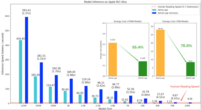 ?實現(xiàn)“不可能的任務(wù)”:測試表明,bitnet.cpp甚至可以在單個CPU上運行高達1000億參數(shù)的BitNet模型,其速度足以達到人類的正常閱讀水平(約每秒5-7個詞元)。這在過去是無法想象的,它意味著未來極其強大的AI模型或許可以直接在用戶的個人設(shè)備上本地運行。