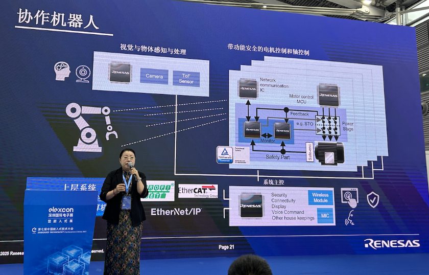 嵌入式AI的跨界應(yīng)用是瑞薩的戰(zhàn)略重點(diǎn)。沈清女士以工業(yè)場(chǎng)景為例,介紹了技術(shù)融合趨勢(shì)。例如,時(shí)間敏感網(wǎng)絡(luò)(TSN)技術(shù)從工業(yè)自動(dòng)化擴(kuò)展到新能源儲(chǔ)能領(lǐng)域,優(yōu)化資源管理。在工業(yè)機(jī)器人領(lǐng)域,瑞薩提供單芯片(RZ/T2H)和雙芯片解決方案,客戶可靈活選擇。
