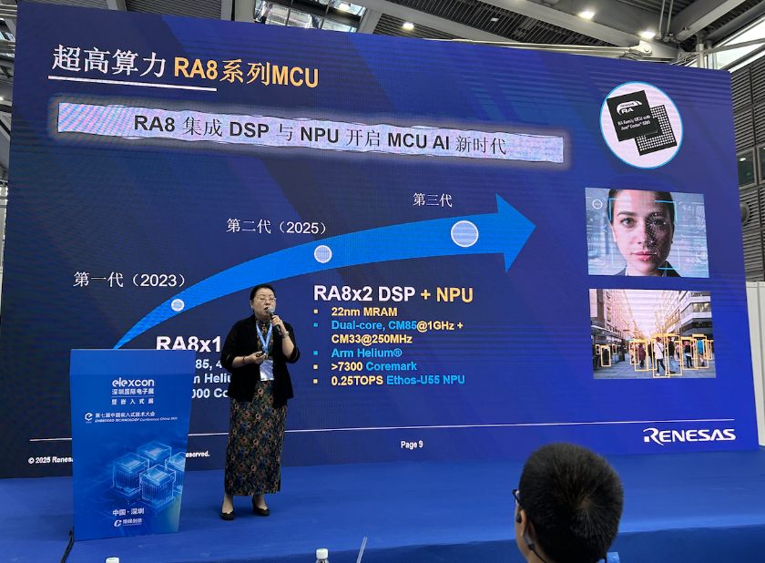 瑞薩的嵌入式AI產(chǎn)品陣容涵蓋MCU和MPU,覆蓋130納米到14納米的工藝節(jié)點(diǎn),產(chǎn)品規(guī)模超1萬(wàn)顆。沈清女士介紹了三大熱門系列,展示瑞薩的技術(shù)實(shí)力: