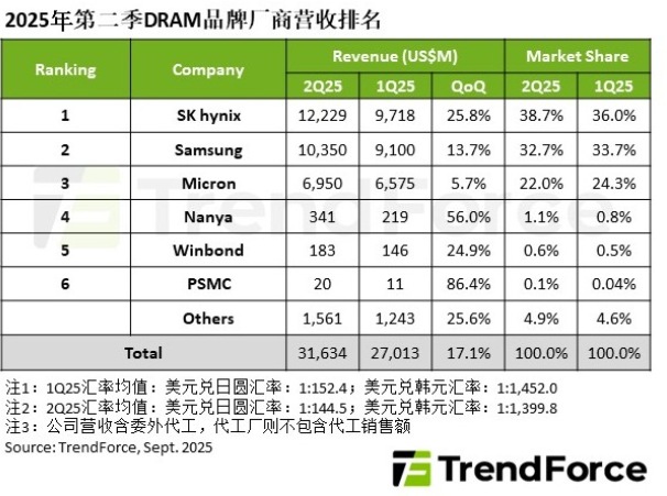 TrendForce集邦咨詢: 2Q25 DRAM營收季增17.1%,SK海力士市占擴大