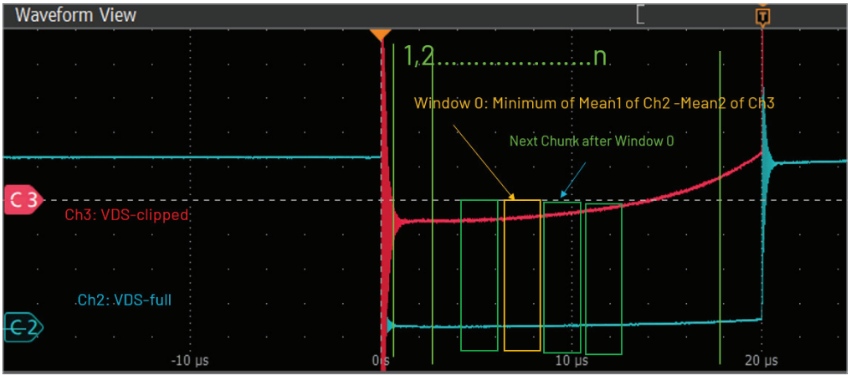 ● 另一個差分探頭僅以高靈敏度捕獲RDS(on)區(qū)域,在FET導通且VDS較小時提供高分辨率。這相當于有意削剪VDS上的信號。注意這種方法類似于使用二極管鉗位電路削剪信號,但需要應用校正以獲得良好結果。