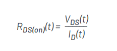 動態(tài)RDS(on)是指FET在開關過程中導通時,漏極與源極端子之間的平均電阻。漏源電阻RDS(on)是所有FET的重要參數,因為它是傳導損耗和效率的一個關鍵因素。RDS(on)通過漏源電壓(VDS)與漏極電流(ID)的比值計算,并可表示為時間的函數: