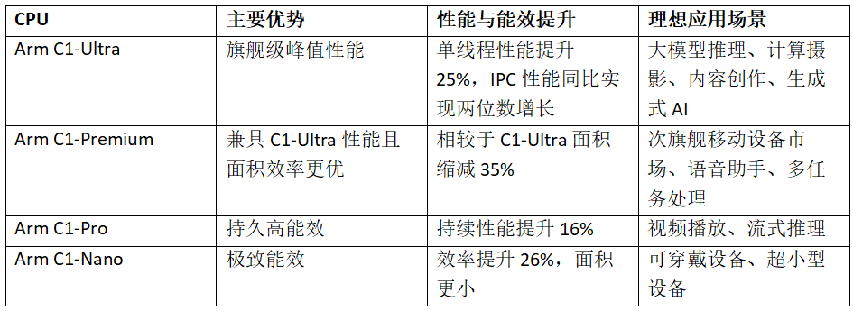 · 新一代搭載 SME2 技術(shù)的 Armv9.3 CPU 集群:包括 Arm C1-Ultra 和 Arm C1-Pro,為旗艦設(shè)備提供支持