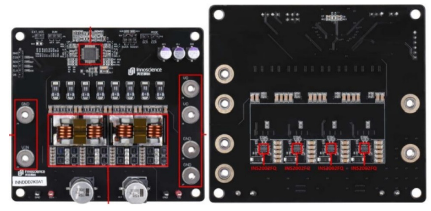 與Si MOS相比,GaN具有出色的開關(guān)特性,且開關(guān)損耗更低。因此能夠?qū)崿F(xiàn)更高的轉(zhuǎn)換效率,并提升開關(guān)頻率,同時(shí)減小磁性器件尺寸和濾波電容體積,進(jìn)而提高功率密度。此次大聯(lián)大詮鼎基于英諾賽科產(chǎn)品推出的兩款方案均采用四相交錯(cuò)Buck拓?fù)?,每相使?顆100V氮化鎵半橋驅(qū)動(dòng)IC INS2002FQ和4顆100V雙面散熱的低壓氮化鎵功率晶體管INN100EA035A進(jìn)行功率傳輸。