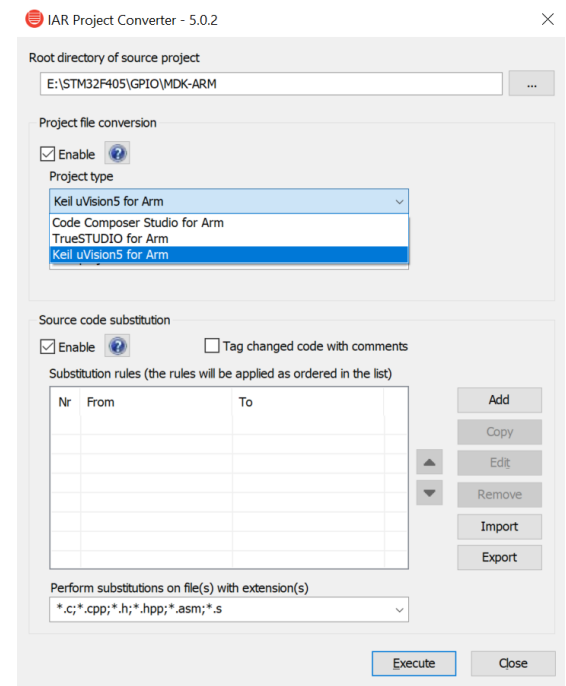 Tools > Project Converter打開IAR Project Converter,對(duì)應(yīng)的Project type選擇Keil μVision5 for Arm,本文以STM32F405的GPIO示例工程為例,點(diǎn)擊Execute: