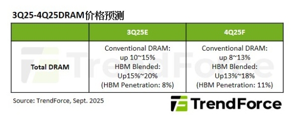 TrendForce集邦咨詢:4Q25 DRAM價(jià)格延續(xù)漲勢,服務(wù)器需求提前發(fā)酵、舊制程產(chǎn)品漲幅仍較大