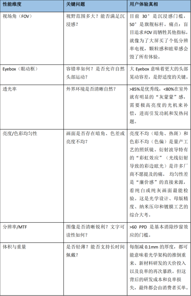我們不僅看數(shù)字,更關(guān)注這些參數(shù)如何影響實(shí)際使用體驗(yàn)。以下是衡量光波導(dǎo)性能的六大關(guān)鍵維度: