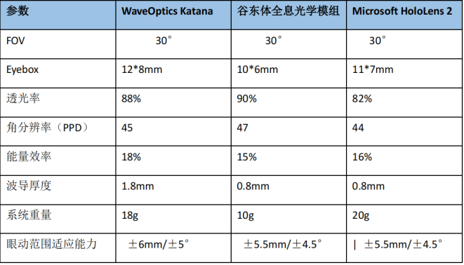 選取MicrosoftHoloLens2(基于LCoS+衍射光波導(dǎo)架構(gòu))及WaveOpticsKatana(30°FOV光機(jī)模組)作為性能基準(zhǔn)對(duì)象,從光學(xué)性能、系統(tǒng)集成度與人因工程三大維度開(kāi)展對(duì)比分。