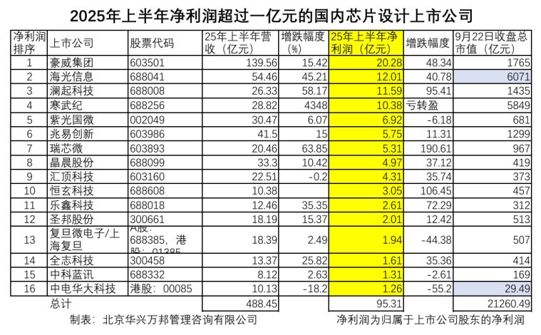 隨著8月29日休市后在香港上市的中國(guó)電子華大科技有限公司(港股代碼:00085)公布其2025年中期業(yè)績(jī)公告,2025年上半年“歸屬上市公司股東凈利潤(rùn)”超過(guò)一億元的國(guó)內(nèi)芯片設(shè)計(jì)上市公司基本浮出水面。根據(jù)北京華興萬(wàn)邦管理咨詢有限公司的統(tǒng)計(jì),目前共有16家上市芯片設(shè)計(jì)公司半年凈利潤(rùn)過(guò)億,加上還有華為海思半導(dǎo)體、紫光展銳和國(guó)網(wǎng)智芯等多家有規(guī)模但未上市的芯片設(shè)計(jì)企業(yè),他們的半年凈利潤(rùn)也有可能超過(guò)了億元,所以國(guó)內(nèi)有20家左右芯片設(shè)計(jì)企業(yè)在今年上半年盈利過(guò)億。他們?cè)谖覈?guó)5000多家芯片設(shè)計(jì)企業(yè)中盈利能力排在了前3%,因而其中每一家都值得大家去關(guān)注和分析。