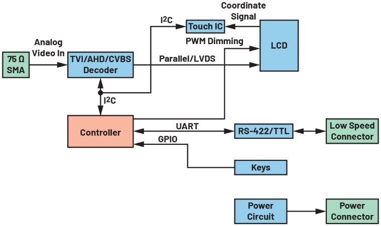 從左側(cè)開始,AVI通過75 Ω連接器連接至系統(tǒng)。隨后,模擬視頻信號被送入TVI/AHD/CVBS解碼器。解碼器將多種視頻格式轉(zhuǎn)換為標準化數(shù)字輸出。