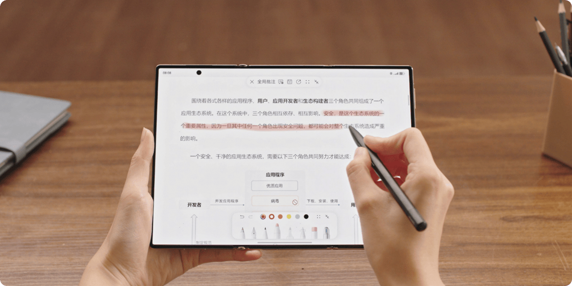 Mate XTs 全新搭載手寫筆,無需適配,系統(tǒng)內(nèi)置全局批注、語音同步批注、提筆速記、按鍵遙控等“即拿即用”的高效功能。