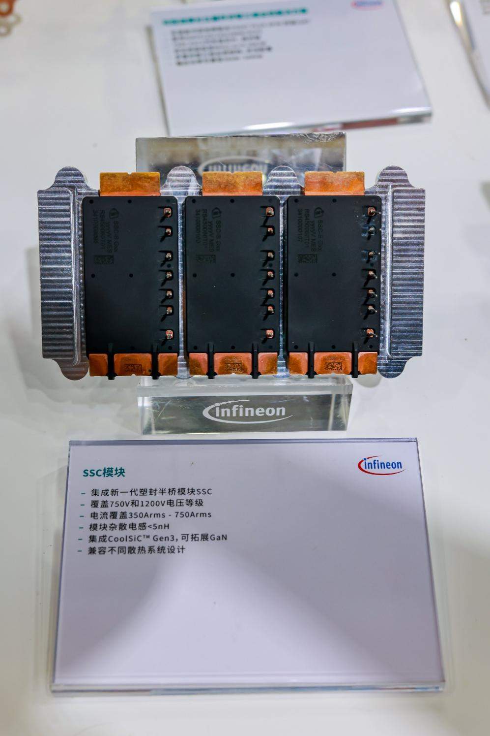 新一代塑封半橋模塊SSC也是此次展出的重點之一,該模塊具有750V和1200V兩個電壓等級,并覆蓋了從350Arms到750Arms的電流范圍。模塊設(shè)計顯著降低了雜散電感至小于5nH,并集成了CoolSiC? Gen3技術(shù),同時也支持GaN的拓展應(yīng)用。此外,該模塊還能兼容不同的散熱系統(tǒng)設(shè)計。