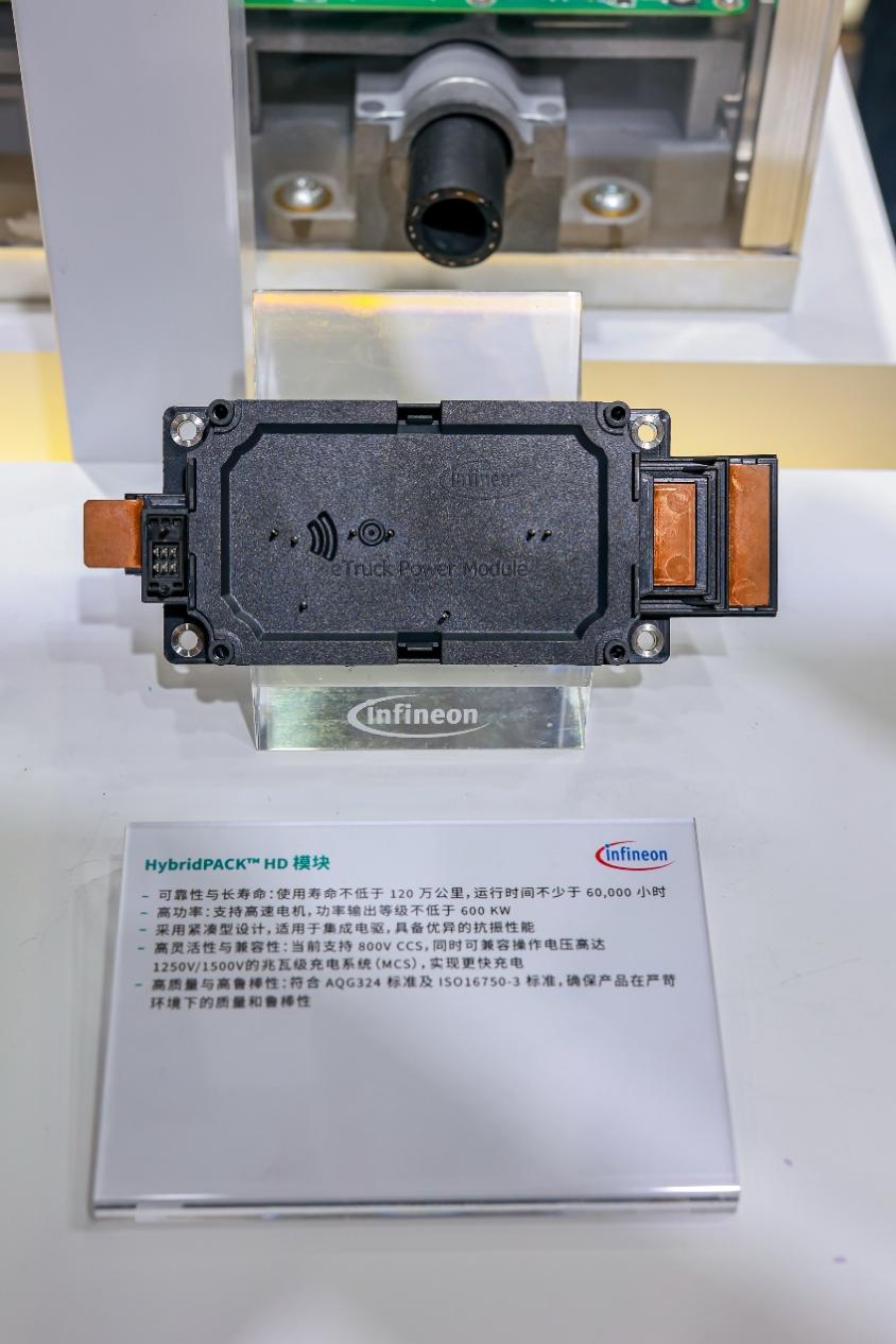 針對電動重卡,英飛凌也有HybridPACK? HD模塊展示。該模塊具備高可靠性與長使用壽命,設(shè)計使用壽命不低于120萬公里,累計運行時間可達60,000小時以上。支持高達600 kW的功率輸出,可適配高速電機應(yīng)用,并采用緊湊化設(shè)計,具備優(yōu)異的抗振性能,適用于高度集成的電驅(qū)系統(tǒng)。該模塊當(dāng)前支持800V CCS充電標(biāo)準(zhǔn),據(jù)英飛凌現(xiàn)場展臺工程師介紹,它也能支持1400V乃至1500V電壓等級,因此同時具備向1250V乃至1500V的兆瓦級充電系統(tǒng)(MCS)兼容的擴展能力。
