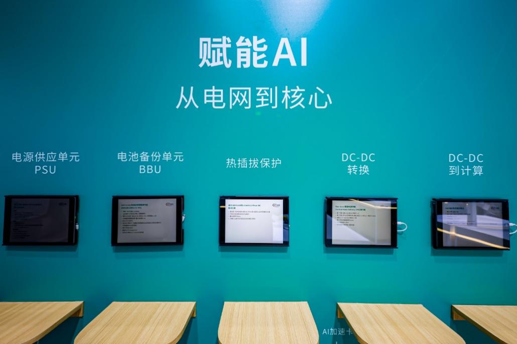 英飛凌在現(xiàn)場展示了針對AI服務(wù)器的從“電網(wǎng)到核心”的完整架構(gòu)及其每一級對應(yīng)的解決方案。當(dāng)前整個AI數(shù)據(jù)中心的電力架構(gòu)轉(zhuǎn)換可以分為大致三級,從220V-48V-12V(8V、6V)-1V(0.8V)。而英飛凌提供的主要方案包括PSU、BBU、熱插拔保護、DCDC轉(zhuǎn)換(IBC)和最后一級的AI芯片DC垂直供電方案。