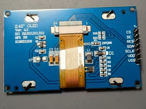 我從全球速賣通買了幾塊2.42英寸的OLED板。因?yàn)槲抑幌胍计聊唬仨殢腜CB中移除。彎曲四個(gè)金屬片,取出金屬環(huán)。屏幕上還附有兩個(gè)小的黑色雙面粘性標(biāo)簽。我用浸漬了異丙醇的工藝刀片來(lái)切割它們。慢慢來(lái)……它被毀了。事實(shí)上,奇跡般地,我一個(gè)都沒(méi)打碎。