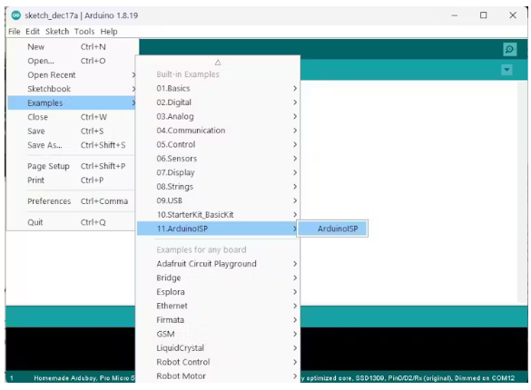 5. 進(jìn)入“File>Examples>ArduinoISP>ArduinoISP”。然后將Arduino UNO與PC/mac連接,然后上傳代碼使Arduino UNO作為ISP