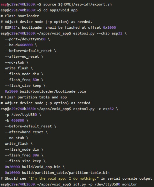 ?將void_app固件映像從容器復(fù)制到主機(jī)。在容器內(nèi),在/home/esp/下