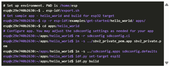 ?在主機(jī)上,將應(yīng)用程序源文件夾放入共享的/目錄中,在容器中,將應(yīng)用程序源文件夾復(fù)制到/home/esp/app/。我們將使用一個(gè)ESP-IDF示例應(yīng)用程序作為示例。內(nèi)部容器