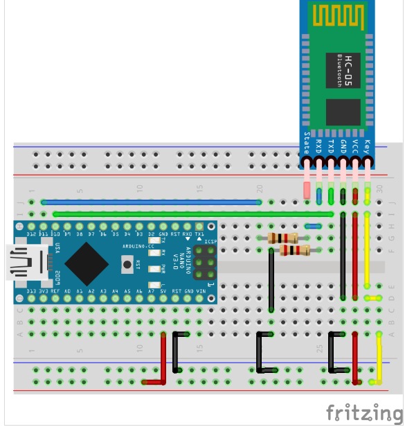 注意:如果我們看原理圖,我們可以看到HC-05模塊的關(guān)鍵引腳連接到Arduino nano的VCC。在上電Arduino之前,應(yīng)將關(guān)鍵引腳連接到VCC,一旦HC-05模塊開始緩慢閃爍,必須斷開連接。