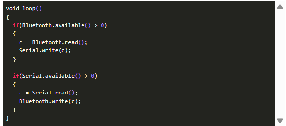 這段代碼在Arduino和藍(lán)牙設(shè)備之間建立了雙向通信,允許您從藍(lán)牙設(shè)備向Arduino發(fā)送AT命令,反之亦然。接收到的字符顯示在串行監(jiān)視器上用于調(diào)試目的。