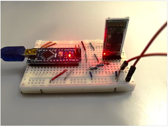 雖然我們?cè)谶@個(gè)項(xiàng)目中使用的是HC-05藍(lán)牙模塊,它非常便宜和耐用,但我們使用分壓器電路來確保RXD引腳不會(huì)損壞。它是通過連接橫跨RXD和引腳11的1k Ω電位器和橫跨RXD和地的2k Ω電位器制成的。