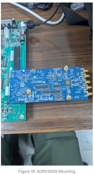 ?安裝ADRV9009 FMC卡:將ADRV9009收發(fā)板固定在ZCU102上的HPC1 FMC連接器上,如圖18所示。