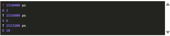 第一個(gè),1510400ps意味著第一個(gè)樣本在1.5104 us之后出現(xiàn)在AI引擎陣列的輸出中。因此這大概就是AI引擎數(shù)組的初始延遲(從第一個(gè)樣本輸入到第一個(gè)樣本輸出)。